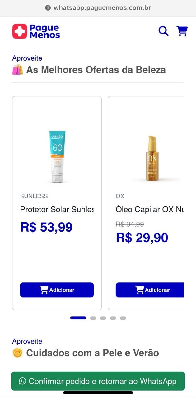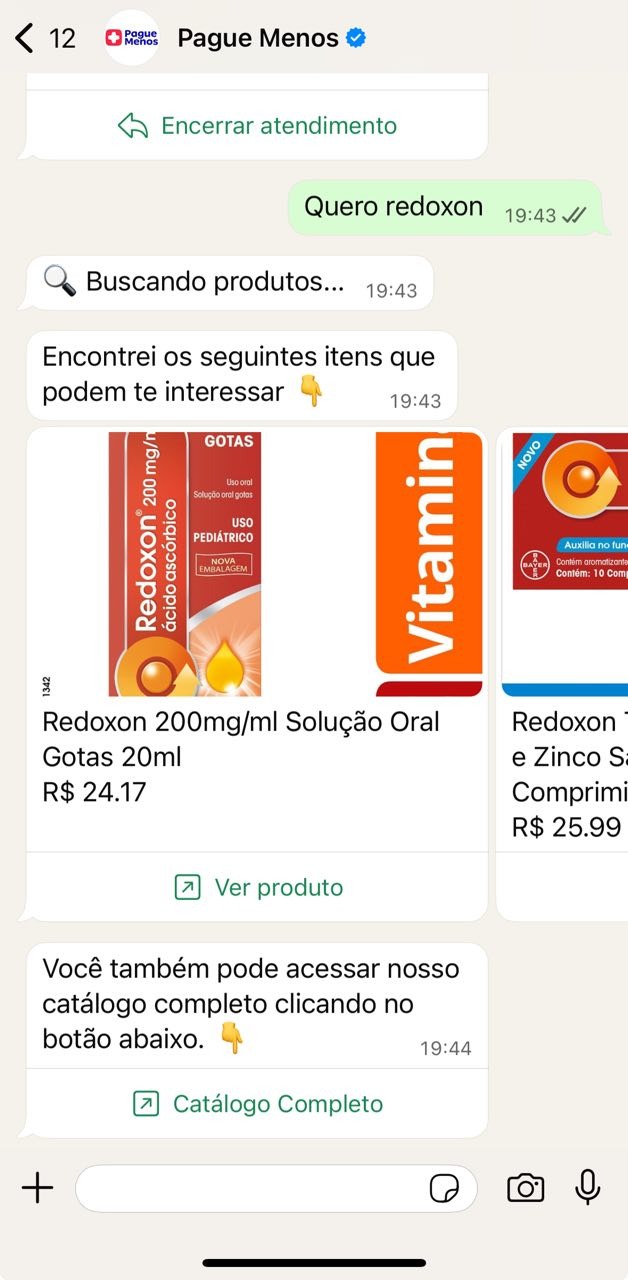 Por exemplo: se o cliente buscar por um produto, como “Redoxon”, a conversa exibe um carrossel com até 10 opções diretamente no WhatsApp.